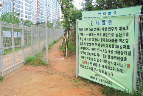 구성읍 언남리 초원마을 성원상떼빌 구성2차 아파트 입주자 대표자회의(회장 조재수)는 지난해 말 성원건설 측과 합의한 사항이 이뤄지지 않자 지난달 12일 성원건설에 요청, 등산로를 전격 폐쇄시켰다.