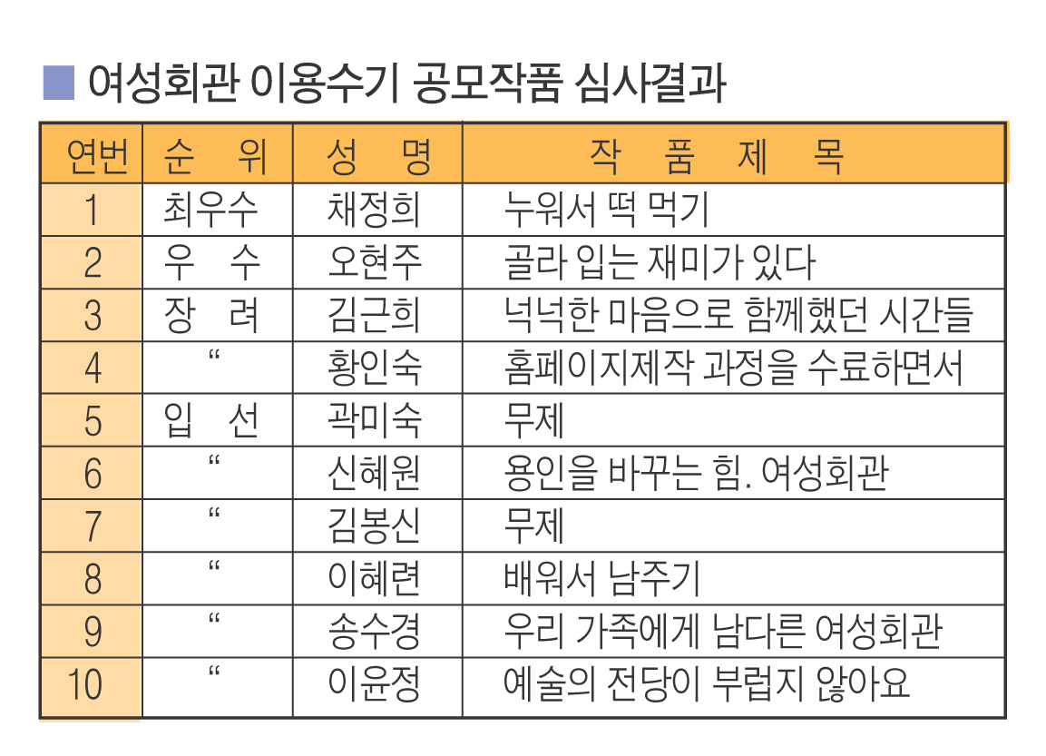 여성회관(관장 이연우)은 제10회 여성주간(7월 1일~7월 7일)을 맞아 그 동안 여성회관을 이용한 시민을 대상으로 ‘여성회관 이용수기 공모’를 실시했다.