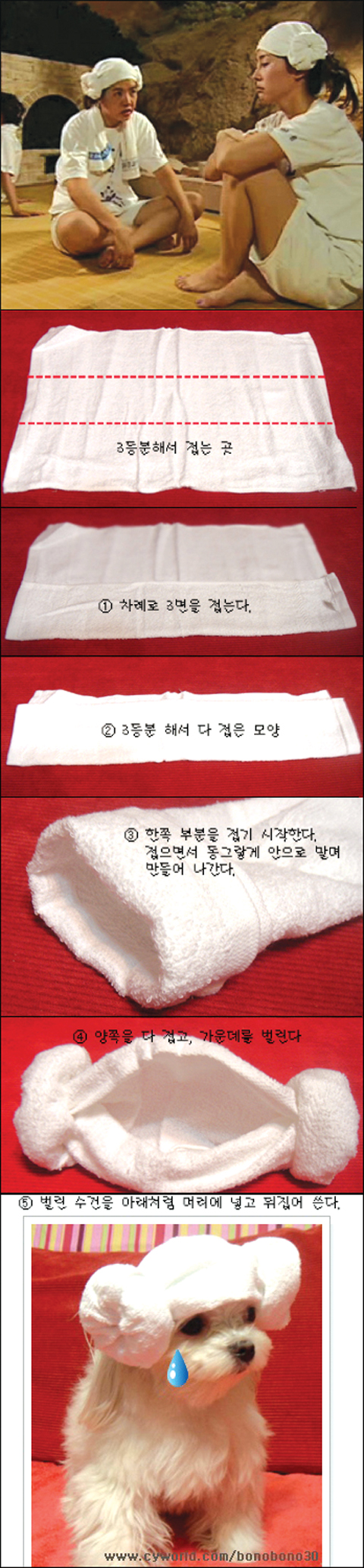 이에 한 네티즌은 모 인터넷 게시판에 수건으로 양머리 만드는 방법을 사진까지 찍어 자세하게 게재해 놓았다. 이를 본 네티즌들은 “아~ 저렇게 하는구나”라며 “꼭 해봐야지”라는 반응을 보이고 있다.
