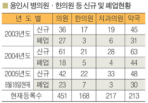 특히 용인시의 경우 병의원(약국 포함)등 의료업체가 1000여 곳이 넘지만, 2003년 1월부터 2005년 8월18일 현재까지 3년도 못돼 무려 200여 곳이 문을 닫았다.