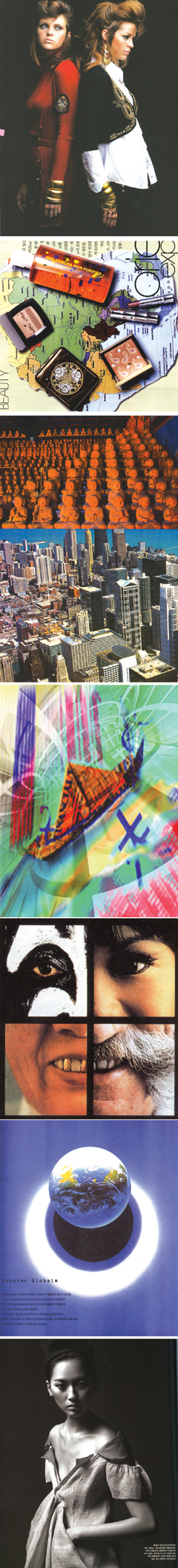이미 세계는 단일 문화권이라 불러도 좋을 만큼 일사분란한 문화시장을 형성하고 있다. 전 세계로 동시에 직배하는 헐리웃 영화, 생중계하는 프레타 포르테 등은 세계인들에게 동시성을 체험하게 하며, 이제 원산지가 어디인가를 따지기보다 디자인과 취향이 최고의 선택 기준이 되고 있다. 이국풍은 더 이상 귀족적 사치 취향이 아니며, 매 시즌 디자이너에 의해 색다르게 리메이크 되는 하나의 장르로 자리 잡았다.