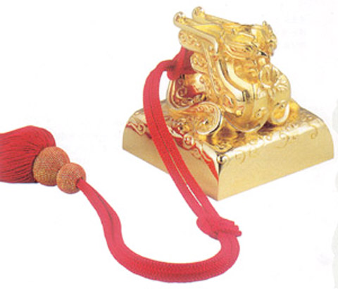 ○…외교문서와 훈장, 각종 공문서에 사용되는 도장인 ‘국새(國璽·사진)’가 금이 가 쪼개질 위험이 있기 때문에 바뀔 전망이다. 감사원은 지난 22일 “한국원자력연구소에 의뢰해 국새를 정밀 검사한 결과 국새 내부의 깊숙한 곳까지 금이 간 사실을 확인했다”며 “조만간 행정자치부에 국새를 교체하라는 내용을 담은 조사 결과를 통보할 예정”이라고 밝혔다. 국새에는 ‘대한민국’이라고 조각돼 있다. - 요(遼)·금(金)시절에는 금인(金印)을 받았고, 원(元)나라 때에는 ‘부마국왕선명정동행중서성(駙馬國王宣命征東行中書省)’의 도장을 받았으며, 명(明)나라 시절에는 ‘고려국왕지인(高麗國王之印)’이라는 도장을 썼었다는데, 대한민국이란 글자가 담긴 국새는 그 하나로 자랑스러워 보인다.