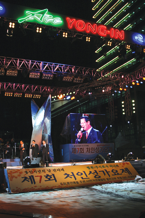 지난달 27일부터 30일까지 용인시문화행정타운에서 열린 ‘ACE 용인 페스티벌’이 시민들의 환영속에 무사히 끝났다. 다양한 프로그램과 풍부한 볼거리로 가득했던 축제 동안 눈길을 끌었던 ‘처인성 가요제’. 이 날 이정문 용인시장과 이우현 시의회의장, 홍영기 예총회장이 시민들에게 열창을 선보이고 있다. <사진 김호경 인턴기자>