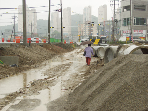 주민들의 안전을 고려한 그 어떤 장치도 없이 공사협조의 입간판 만이 세워져 있고 한대의 차량도 통과하기 힘들정도로 도로가 좁아져 있다.