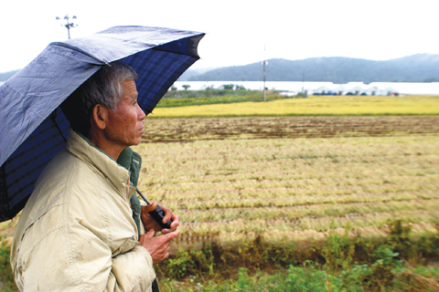가을비가 유난히 자주 내린다. 농부는 논바닥에 베어 놓은 벼가 물에 잠길까 걱정스런 눈빛으로 하염없이 들녘을 바라본다. 추곡수매에서 공공비축제로 전환돼 쌀값은 더욱 떨어지고, 농부의 시름을 아는지 모르는지 비는 아랑곳하지 않고 하루 종일 내린다. 사진은 지난 7일 남사면 진목리에서.