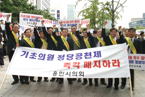 용인시의회의원 10여명을 비롯한 전국 시군자치구의회 의원 5000여명은 지난 13일 여의도 국회의사당 앞에서 ‘공직선거법 개정 촉구를 위한 규탄 결의대회“에 참가, 국회를 향해 비난의 목소리를 높였다.