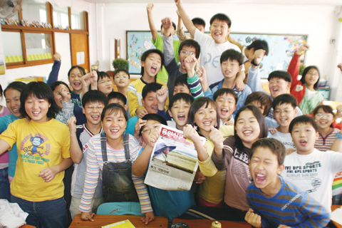 용인의 풀뿌리 언론으로 창간 13주년을 맞고 있는 용인신문이 지령 600호를 맞이했다. 최근에는 지역의 초등학교에서 용인신문을 활용해 교육효과를 높이는 NIE(Newspaper In Education)도 진행되고 있다. 사진은 지난 14일, 지령 600호를 축하하며 “용인신문 화이팅”을 외치는 용인초등학교 5학년 2반 어린이들.<사진 / 김호경 기자>