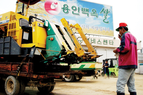 쌀값하락과 추곡수매 폐지로 쌀농가들이 시름을 앓고있는 가운데 이동면 농기계수리센타에서 한해 농사를 마무리하며 콤바인을 점검하고 집으로 돌아가려는 노인이 용인백옥쌀 광고판을 바라보며 담배를 태우고있다.