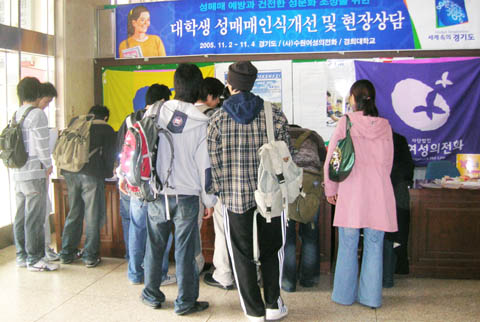 2005년 11월 2일 부터 4일까지 경희대학교 학생회관에서 대학생들이 성매매 인식개선에 대한 의식조사에 참여, 성매매안하기 운동의 동참에 서명하고 있다.