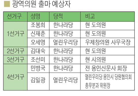 내년지방선거에 있어 용인지역의 광역의원의원정수는 변함없지만 예전의 1선거구(중앙, 동부, 유림, 역삼, 이동, 남사)와 2선거구(포곡, 모현, 양지, 백암, 원삼)가 통합되고, 3선거구(기흥읍, 구성읍)가 2개 선거구로 분할되는 등의 변화와 함께 거론되는 후보가 적어 대결구도에 대한 윤곽이 잡히지 않고 있다.