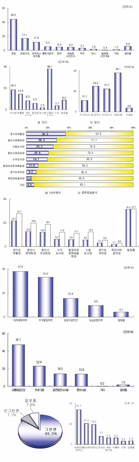 용인시민의 44.5%는 가장 선호하는 문화예술 장르로 ‘영화’를 꼽았다. 그 다음은 대중가요(17.1%), 연극이나 뮤지컬(11.6%), 클래식 음악(5.3%), 문학(4.8%), 미술 및 사진 전시(4.3%), 국악(3.1), 댄스(1.8%), 발레 등 고전무용(0.4%) 순으로 나타났다. 한편, 기타는 1.2%, 잘 모르겠다는 응답은 5.9%였다.