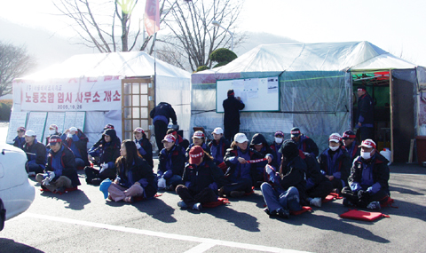 2일 현재 노조60여명은 서울레이크사이드CC 주차장에서 비닐천막 2동을 설치하고 숙식을 해결하며 파업을 이어가고 있다.