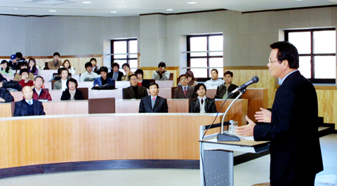 이날 특강에서 이 시장은 주5일제 근무에 따른 문화관광 산업시대에 부응해 도시로의 육성 등 용인시의 관광 인프라 구축과 글로벌 경쟁력을 갖춘 지식기반 허브도시로의 육성 등 용인시 미래 비전에 대해 설명하고 참석한 학생과 교수들에게 큰 호응을 얻어냈다.