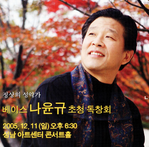 드림싱어즈의 지휘자이면서 이탈리아 나폴리 ‘존타’ 국제콩쿨에서 2등을 하는 등 실력을 인정받은 베이스 나윤규씨의 독창회가 오는 11일 오후 6시 30분 성남아트센터 콘서트 홀에서 열린다.