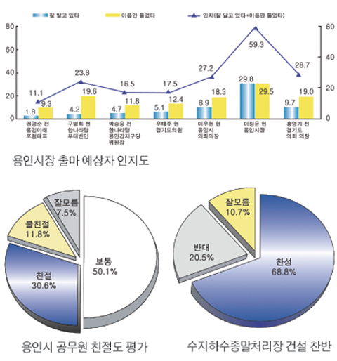 용인시민들의 정당지지도를 조사한 결과, 한나라당(40.6%)이 열린우리당(15.1%)보다 25.5% 높게 나타났다. 또한 내년도 용인시장 출마예상자들의 인지도 조사에서는 이정문 현 용인시장이 59.3%로 다른 후보들보다 배 이상 높았다.<관련기사 8~9면>