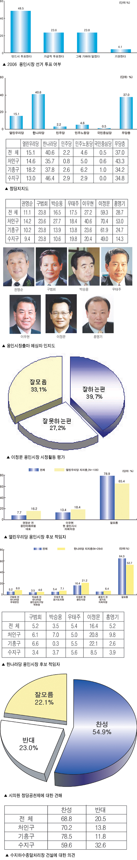 용인신문사가 창간13주년을 맞아 여론조사 전문기관인 (주)한길리서치연구소와 공동으로 내년도 지방선거를 앞두고 지역 현안에 대한 시민의식을 조사했다. 크게 10가지의 구조화된 질문지를 이용한 전화면접법을 이용했다. 표본오차는 95% 신뢰수준에 ±3.7%P.<편집자 주>