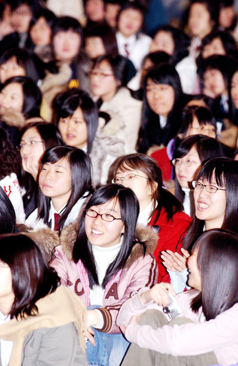 영하의 강추위 속에 용인실내체육관에서 열린 2005 청소년 어울마당 ‘고3 수험생 파이팅’ 행사에서 대입 수능시험을 마친 수험생들이 모처럼 밝게 웃고 있다. 하얀 이를 드러내며 허드러지게 웃는 수험생들의 밝은 모습을 보며 모두의 마음을 모아 고득점 합격을 기원해 본다.<조형기 전문기자>