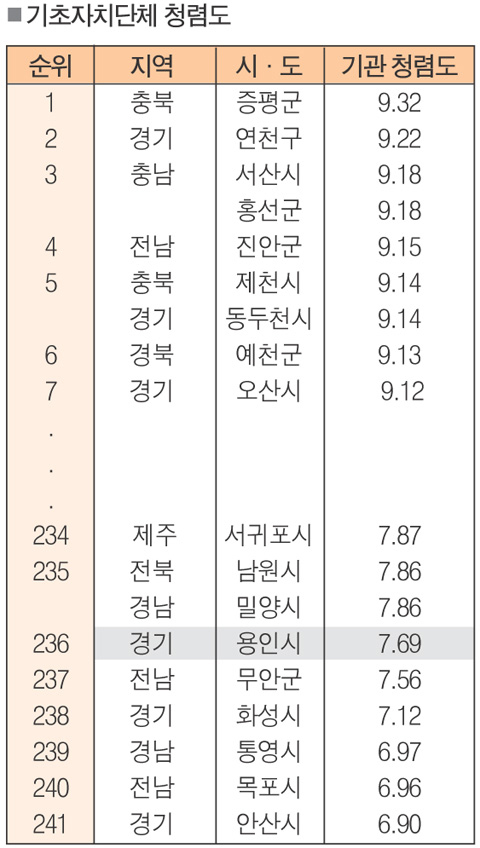 용인시의 청렴도가 전국 241개 지방자치단체 중 여섯번째, 경기도 내에서는 세번째로 낮게 평가됐다.