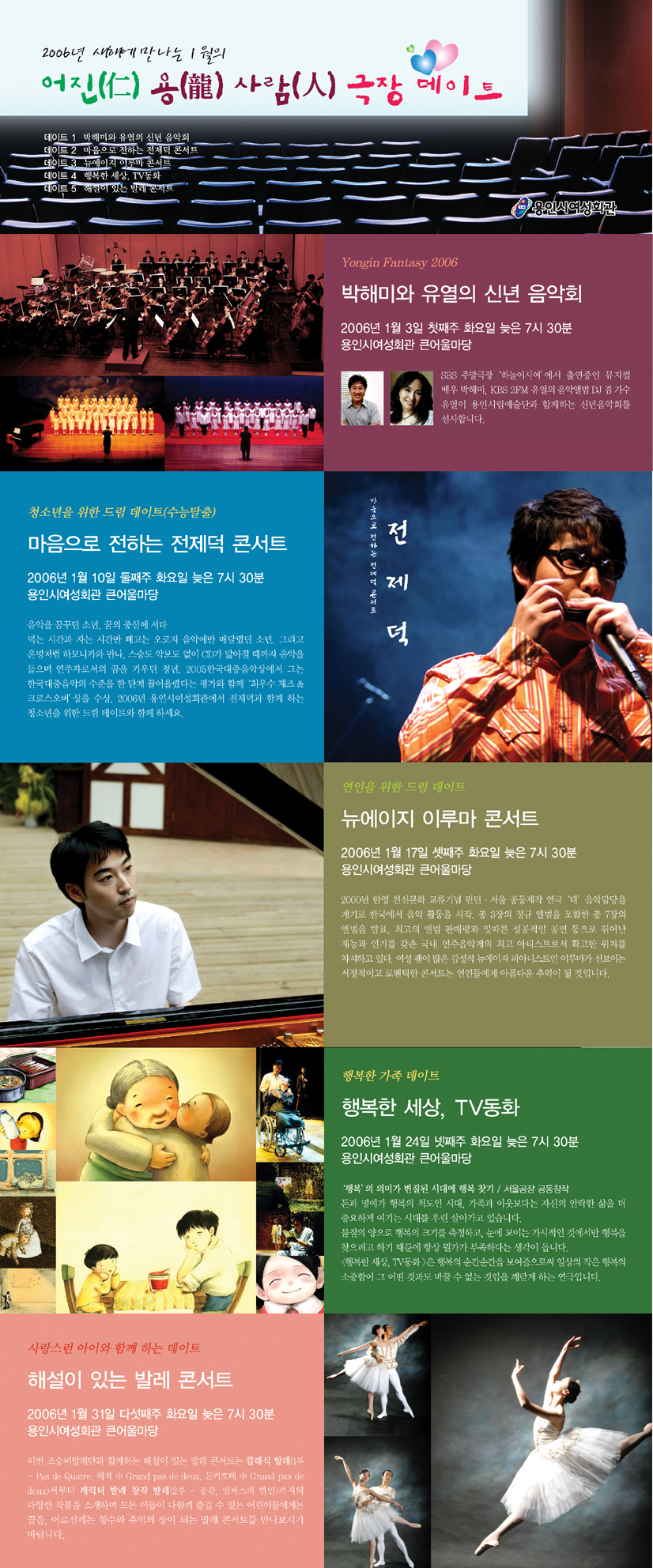 용인시여성회관은 지금까지 주민들에게 많은 인기를 모았던 ‘화요음악회’를 올해부터 음악뿐만 아니라 연극, 발레 등 다양한 장르의 공연을 기획하기로 하고 ‘2006년에 만나는 어진(仁 ) 용(龍) 사람(人) 극장데이트’라는 테마로 1월공연을 다양하게 준비한다.