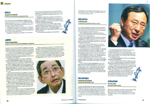 아시아머니지의 이번 선정은 아시아 10여개국에 대해 해당국가에서 탁월한 경영능력을 발휘한 경영진에게 수여하는 상으로 주요 자산분석가, 펀드 매니저 등 경영성과를 분석하는 전문가가 자문해 결정됐다.
