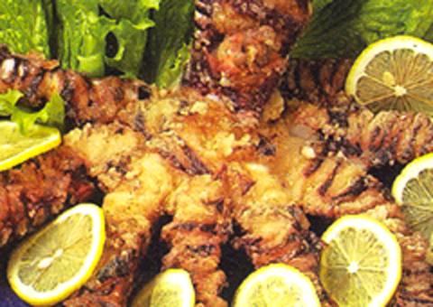 어떻게 그 크기를 재료 그대로 유지할 수 있을까? 문어요리의 경우, 미리 발에다 칼자국을 잘게 내기 때문에 통째로 튀겨도 결코 오그라들지 않는다.