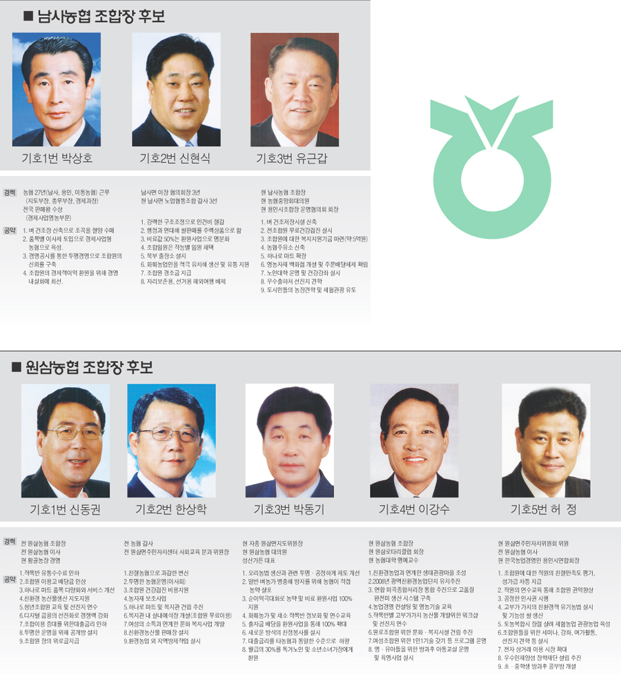 원삼농협은 기호1번에 신동권 후보, 기호 2번에 한상학 후보, 기호3번에 박동기 후보, 기호 4번에 이강수 후보, 기호 5번에 허정 후보로 정해졌다.