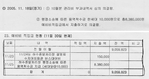 뿐만 아니라 지난해 12월 동성2차 관리비 내역서에는 수지하수처리장건립투쟁연합회(회장 손남호)가 용인시를 상대로 준비중인 행정소송을 위해 각 세대당 1만원씩을 산정, 총 838만원의 금액을 예비비에서 지출했다고 기록돼 있다.