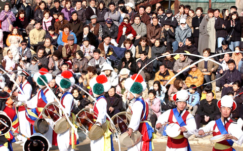 설 명절을 보낸 시민들이 민속촌을 찾아 풍물놀이를 즐기고 있다. 3일간의 짧은 연휴지만 풍물놀이를 관람하며 내일을 충전하는 시민들의 표정은 저마다 여유가 들어있다. <사진/조형기 기자>