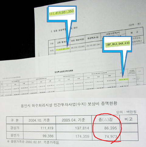 실제 ‘혈세 800억 날려…’기사는 지난 2004년 10월 수지하수종말처리장 보상 추정액이 1114억 1898여만원으로 산정돼 있었으나 토지가격상승 등으로 지난 2005년 10월 보상액 감정평가액이 1978억 1394여만원으로 상승, 863억여원의 보상액이 증가한 것을 바탕으로 기사화 했다. (사진 참조)