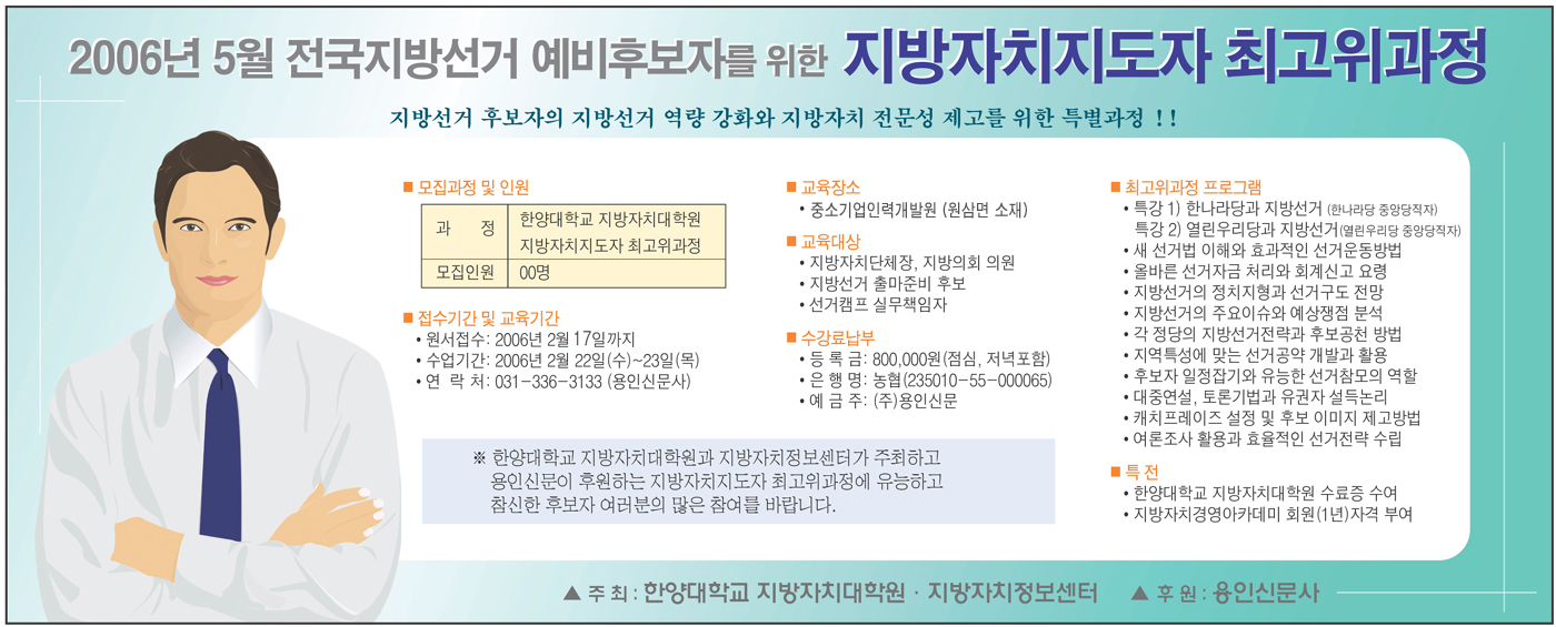 한양대 지방자치대학원과 지방자치정보센터가 주최하고 용인신문사가 후원하여 2006년 5월31일에 실시될 전국지방선거 출마후보의 전문성 제고와 역량 강화를 위한 특별과정으로 지방자치지도자 최고위과정을 개설합니다.