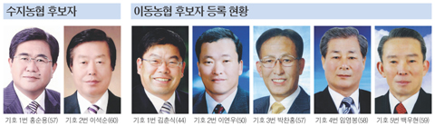 지난 5일 후보자 등록을 마감한 이동농협은 현 조경묵 조합장이 불출마 함에도 불구하고 농협의 전 이사·감사 5명이 출마를 선언했다. 도시농협의 대표적 모델인 수지 농협 조합장 선거에는 현 이석순 조합장과 수지농협 총무과장 등을 역임한 홍순용씨가 출마했다.