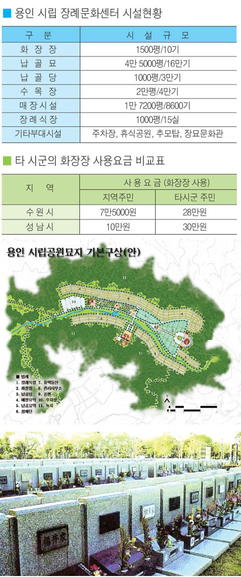 용인의 경우 화장장이 없어 인접한 수원이나 성남의 장례문화센터를 이용하고 있는 것이 현실이다. 이로인해 용인 시민들은 당해 지역의 시민들보다도 보통 3~4배가 넘는 이용료를 부담하고 있으며 그나마도 이용하기가 어려워 벽제나 원주, 충주까지 가고 있는 실정이다. 뿐만 아니라 납골당의 경우에는 타 지역 주민이기 때문에 분양조차 받을 수 없다.