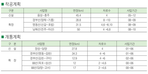 건교부는 올해 경부선 양재~기흥, 영동선 신갈~호법 등 3개 확장구간과 음성~충주고속도로 신설구간에 대해 착공에 들어간다.
