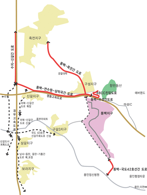 지난 2월 27일 시에서 추진하는 신갈~수지간 도로 일부와 한국토지공사가 시행하는 동백~죽전간 도로 등 동백지구 인근 6개 도로의 사용이 개시됐다. 이는 동백 택지개발지구 아파트 입주시점에 맞춰 공사 완료된 구간 일부에 대한 개통이긴 하지만 아직까지 도로 사용자들이 많지 않은 편이라 소통이 원활하다.
