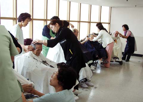 할아버지와 할머니들에게 다정한 목소리로 말을 건내며 무료로 이발 봉사를 하고 있는 신갈농협실버자원봉사단(단장 이명자)이 방문한 것.