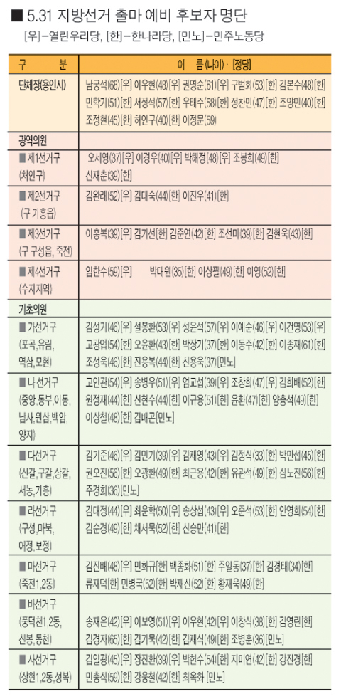 또 의원정수가 1명이 늘어난 다 선거구(신갈,상갈,구갈,기흥,서농)의 경우 초선 출마자들이 대거 공천을 신청해 눈길을 끌고 있다.