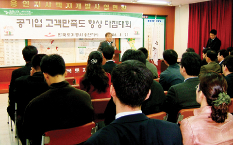한국토지공사 용인지사는 지난 21일 ‘고객입장에서 생각하고 행동하는 고객감동을 실천하자’라는 표어로 고객만족도를 향상하기 위한 다짐대회를 개최했다.