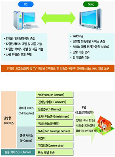 TV는 언제 어니서나 누구나가 쉽게 시청할수 있으나 단방향적 서비스란 단점이 있다. 인터넷은 양방향 서비스 중심이고, 다양한 비스 개발 및 제공이 가능하지만 사용연령층에는 분명 한계가 존재한다.