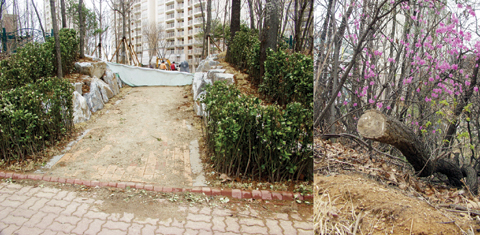 이에 시공을 맡고 있는 D건설사 관계자는 “아파트 입주자들이 근린공원 진입을 위해 통행로를 만들어 달라고 민원을 제기할 것을 예상해 지금의 통행로에 있는 나무들은 처음부터 이식을 시켜 놓았다”며 “불법으로 벌목했다는 주장은 터무니없는 것”이라고 반박했다.
