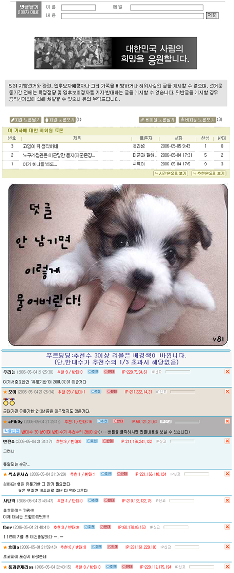 얼마전 여기자 성추행으로 비난을 받았던 최연희 의원이 경우 “가슴 만지는게 성추행인줄 몰랐다. 파문!”이란 신문 헤드라인 같은 댓글이 올라와 실소를 자아내기도 했다.