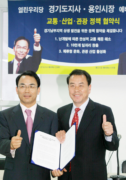 열린우리당 진대제 경기도지사 후보와 이우현 용인시장후보는 지난 14일 이 후보의 선거사무실에서 ‘아름다운 용인건설’을 위한 정책협약식을 갖고 정책실현을 위해 최선을 다 할 것을 다짐했다.