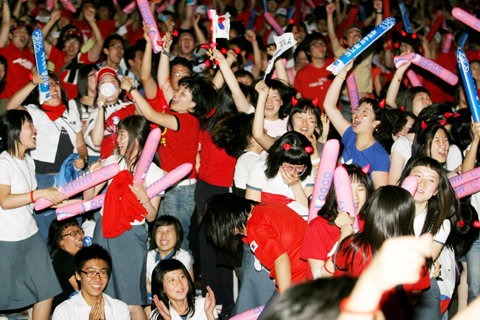 지난 13일 행정타운에는 경찰추산 1만 2000여명이 넘는 시민이 모여 월드컵대회 토고전 응원에 나섰다. 이날 한국이 골을 넣자 시민들이 벌떡 일어서 기쁨을 만끽하고 있다. 하지만 경기가 끝난 후 응원장이 정리되지 않은 모습에서 아쉬움을 남기기도 했다. <사진/김호경기자>