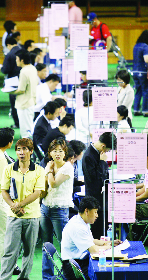 월드컵에 들뜬 분위기지만 실업자들에겐 취업이 그 무엇보다 중요한 일이다. 지난 15일 용인실내체육관에서 열린 채용박람회에는 2000여명의 구직자들이 모여 그 열기를 실감케 했다. 이번 행사의 구인수요가 800여명이라고 하니 적은 수가 아닌데도 긴장감이 맴돈다.