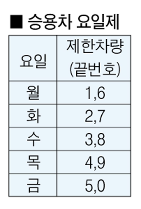 월요일에는 차량 끝번호가 1번과 6번, 화요일에는 2번과 7번, 수요일에는 3번과 8번, 목요일에는 4번과 9번, 금요일에는 5번과 0번의 차량출입이 제한되며 공무원과 직원뿐만 아니라 시민들도 기관 방문시 요일제 적용을 받아 차량 출입을 할수 없다.
