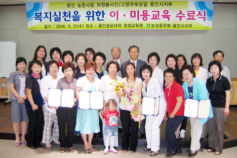 농협용인시지부(지부장 리희열)의 고향주부모임(회장 이승희)을 주축으로 구성된 ‘용인 농촌사랑 자원봉사단’은 지난 21일 용인송담대 평생교육원에서 이ㆍ미용 교육 수료식을 개최했다.