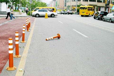 지난달 27일 용인시수지여성회관 앞에 불법주차와 버스이외의 차량 진입 차단하는 시설물이 파손된 채 방치돼 있다.