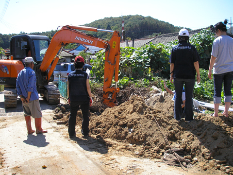 백암면사무소 총무과 직원들도 관심으로 공사를 위해 노력하고 백암면 고안리에 사는 황 규만씨도 한 걸음에 공사현장으로 달려와 포크레인으로 하수관을 묻을 땅을 직접 파 주었다.
