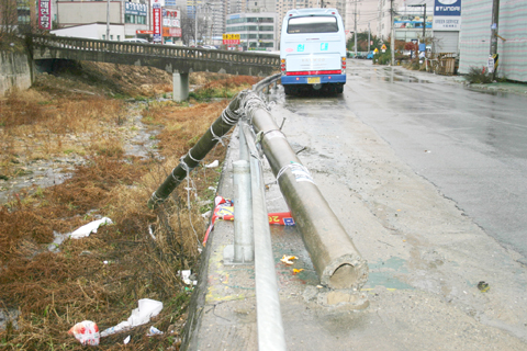 부슬부슬 겨울 비가 촉촉히 내리던 지난 4일 수지구 동천동 가구단지 입구에 전봇대가 흉물스럽게 쓰러져 있다. 도대체 누가, 어떻게, 왜 부러뜨렸는지 궁금하다. 아님 저절로 쓰러진걸까?