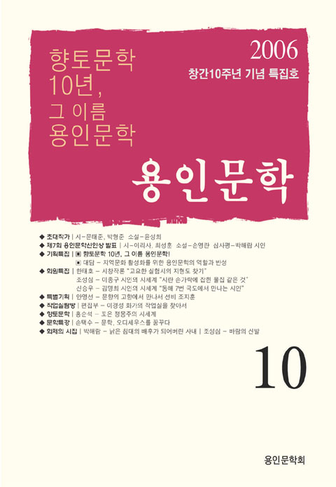 용인 최초의 향토문학단체인 용인문학회(회장 김종경)가 창립 10주년을 맞이해 ‘용인문학’ 지령 10호 기념 특집호를 출간했다.
