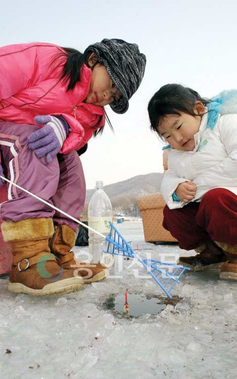 ‘움찔’, ‘움찔’ 흔들리는 찌를 잽싸게 낚아채자 어른 손가락만 한 은빛 빙어가 올라온다. 운이 좋으면 한꺼번에 줄줄이 엮은 굴비처럼 네댓 마리가 올라오기도 한다. 쉴 새 없이 올라오는 녀석들을 처치하는 가장 기막힌 방법은 그 자리에서 산 채로 초고추장에 푹 찍어 한 입에 먹어버리는 것. 차갑고 신선하며 고소한 빙어의 참 맛은 입질을 기다리며 덜덜 떨던 시간을 잊어버리게 만든다. 사진은 지난 11일 처인구 원삼면의 두창저수지. <사진 / 김호경 기자>